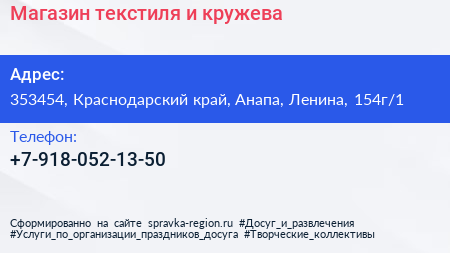 Магазин текстиля и кружева по адресу 353454, Краснодарский край, Анапа, Ленина, 154г/1 в дальнейшем Организация, размещена в следующих категориях: