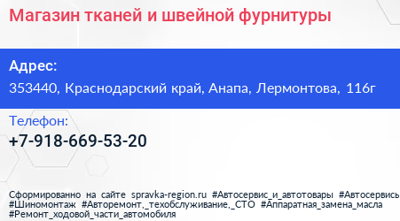 Магазин тканей и швейной фурнитуры по адресу 353440, Краснодарский край, Анапа, Лермонтова, 116г в дальнейшем Организация, размещена в следующих категориях: