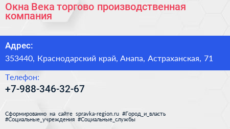 Окна Века, торгово-производственная компания по адресу 353440, Краснодарский край, Анапа, Астраханская, 71 в дальнейшем Организация, размещена в следующих категориях:
