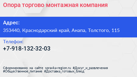 Опора, торгово-монтажная компания по адресу 353440, Краснодарский край, Анапа, Толстого, 115 в дальнейшем Организация, размещена в следующих категориях: