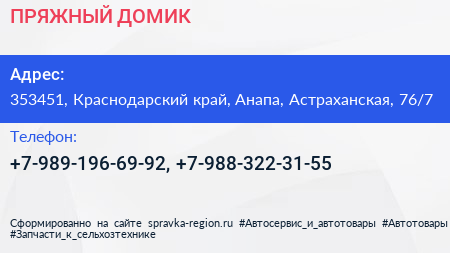 ПРЯЖНЫЙ ДОМИК по адресу 353451, Краснодарский край, Анапа, Астраханская, 76/7 в дальнейшем Организация, размещена в следующих категориях: