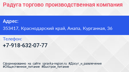 Радуга, торгово-производственная компания по адресу 353417, Краснодарский край, Анапа, Курганная, 36 в дальнейшем Организация, размещена в следующих категориях: