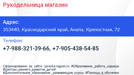 Рукодельница, магазин по адресу 353440, Краснодарский край, Анапа, Крепостная, 72 в дальнейшем Организация, размещена в следующих категориях: