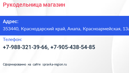 Рукодельница, магазин по адресу 353440, Краснодарский край, Анапа, Красноармейская, 13а в дальнейшем Организация, размещена в следующих категориях: