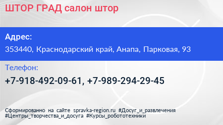 ШТОР-ГРАД, салон штор по адресу 353440, Краснодарский край, Анапа, Парковая, 93 в дальнейшем Организация, размещена в следующих категориях: