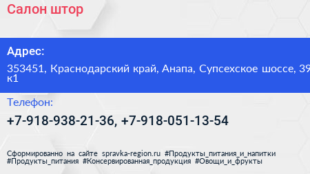 Салон штор по адресу 353451, Краснодарский край, Анапа, Супсехское шоссе, 39 к1 в дальнейшем Организация, размещена в следующих категориях: