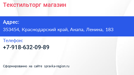 Текстильторг, магазин по адресу 353454, Краснодарский край, Анапа, Ленина, 183 в дальнейшем Организация, размещена в следующих категориях:
