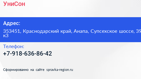 УниСон по адресу 353451, Краснодарский край, Анапа, Супсехское шоссе, 39 к3 в дальнейшем Организация, размещена в следующих категориях: