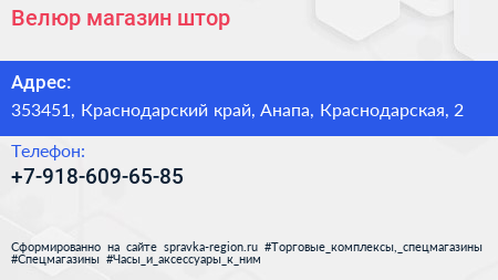 Велюр, магазин штор по адресу 353451, Краснодарский край, Анапа, Краснодарская, 2 в дальнейшем Организация, размещена в следующих категориях: