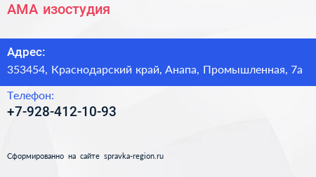 АМА, изостудия по адресу 353454, Краснодарский край, Анапа, Промышленная, 7а в дальнейшем Организация, размещена в следующих категориях: