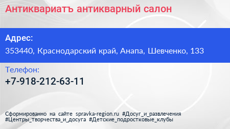 Антиквариатъ, антикварный салон по адресу 353440, Краснодарский край, Анапа, Шевченко, 133 в дальнейшем Организация, размещена в следующих категориях: