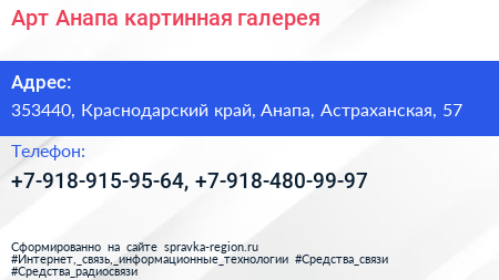 Арт-Анапа, картинная галерея по адресу 353440, Краснодарский край, Анапа, Астраханская, 57 в дальнейшем Организация, размещена в следующих категориях: