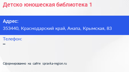 Детско-юношеская библиотека №1 по адресу 353440, Краснодарский край, Анапа, Крымская, 83 в дальнейшем Организация, размещена в следующих категориях:
