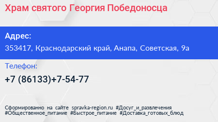 Храм святого Георгия Победоносца по адресу 353417, Краснодарский край, Анапа, Советская, 9а в дальнейшем Организация, размещена в следующих категориях: