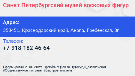 Санкт-Петербургский музей восковых фигур по адресу 353451, Краснодарский край, Анапа, Гребенская, 3г в дальнейшем Организация, размещена в следующих категориях: