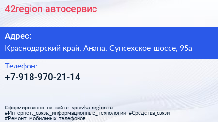 42region, автосервис по адресу Краснодарский край, Анапа, Супсехское шоссе, 95а в дальнейшем Организация, размещена в следующих категориях: