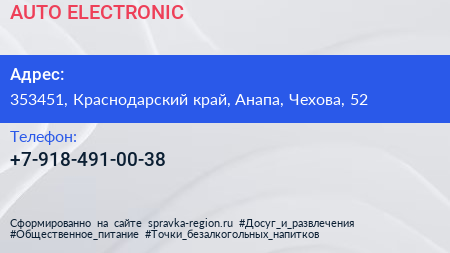 AUTO-ELECTRONIC по адресу 353451, Краснодарский край, Анапа, Чехова, 52 в дальнейшем Организация, размещена в следующих категориях: