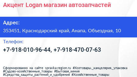 Акцент Logan, магазин автозапчастей по адресу 353451, Краснодарский край, Анапа, Объездная, 10 в дальнейшем Организация, размещена в следующих категориях: