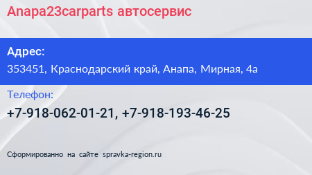 Anapa23carparts, автосервис по адресу 353451, Краснодарский край, Анапа, Мирная, 4а в дальнейшем Организация, размещена в следующих категориях:
