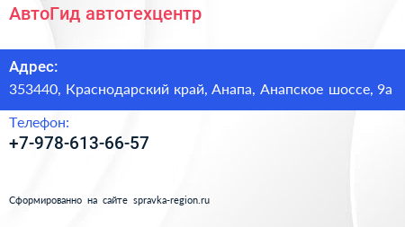 АвтоГид, автотехцентр по адресу 353440, Краснодарский край, Анапа, Анапское шоссе, 9а в дальнейшем Организация, размещена в следующих категориях: