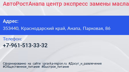 АвтоРостАнапа, центр экспресс-замены масла по адресу 353440, Краснодарский край, Анапа, Парковая, 86 в дальнейшем Организация, размещена в следующих категориях: