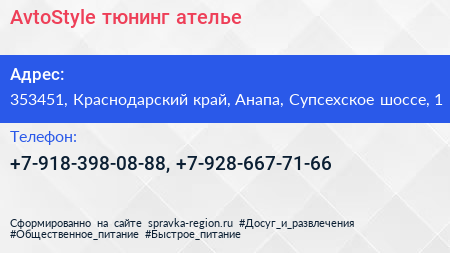 AvtoStyle, тюнинг ателье по адресу 353451, Краснодарский край, Анапа, Супсехское шоссе, 1 в дальнейшем Организация, размещена в следующих категориях: