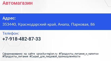 Автомагазин по адресу 353440, Краснодарский край, Анапа, Парковая, 86 в дальнейшем Организация, размещена в следующих категориях: