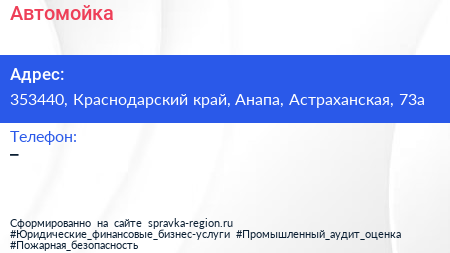 Автомойка по адресу 353440, Краснодарский край, Анапа, Астраханская, 73а в дальнейшем Организация, размещена в следующих категориях: