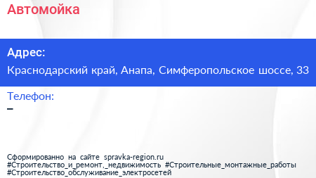 Автомойка по адресу Краснодарский край, Анапа, Симферопольское шоссе, 33 в дальнейшем Организация, размещена в следующих категориях: