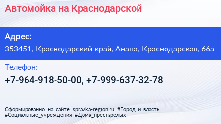 Автомойка на Краснодарской по адресу 353451, Краснодарский край, Анапа, Краснодарская, 66а в дальнейшем Организация, размещена в следующих категориях: