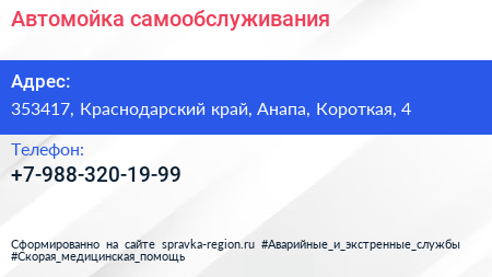 Автомойка самообслуживания по адресу 353417, Краснодарский край, Анапа, Короткая, 4 в дальнейшем Организация, размещена в следующих категориях: