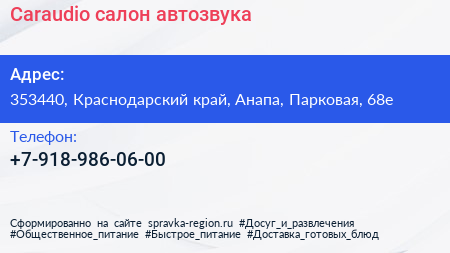Caraudio, салон автозвука по адресу 353440, Краснодарский край, Анапа, Парковая, 68е в дальнейшем Организация, размещена в следующих категориях: