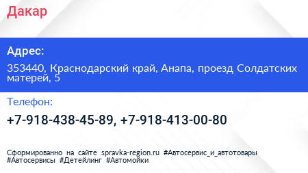 Дакар по адресу 353440, Краснодарский край, Анапа, проезд Солдатских матерей, 5 в дальнейшем Организация, размещена в следующих категориях: