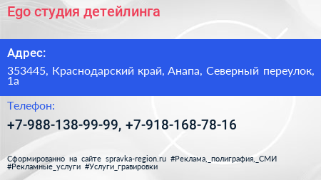Ego, студия детейлинга по адресу 353445, Краснодарский край, Анапа, Северный переулок, 1а в дальнейшем Организация, размещена в следующих категориях: