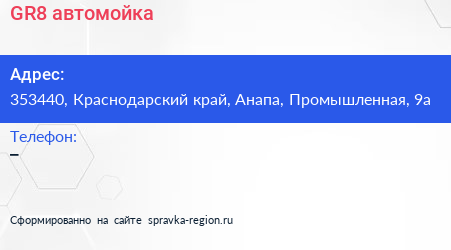 GR8, автомойка по адресу 353440, Краснодарский край, Анапа, Промышленная, 9а в дальнейшем Организация, размещена в следующих категориях: