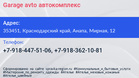 Garage-avto, автокомплекс по адресу 353451, Краснодарский край, Анапа, Мирная, 12 в дальнейшем Организация, размещена в следующих категориях:
