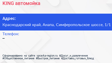 KING, автомойка по адресу Краснодарский край, Анапа, Симферопольское шоссе, 1/1 в дальнейшем Организация, размещена в следующих категориях: