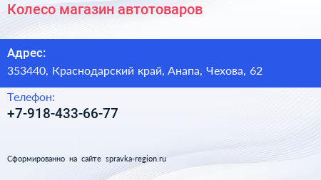 Колесо, магазин автотоваров по адресу 353440, Краснодарский край, Анапа, Чехова, 62 в дальнейшем Организация, размещена в следующих категориях: