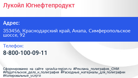 Лукойл-Югнефтепродукт по адресу 353456, Краснодарский край, Анапа, Симферопольское шоссе, 92 в дальнейшем Организация, размещена в следующих категориях:
