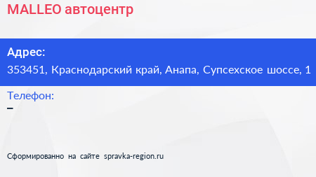 MALLEO, автоцентр по адресу 353451, Краснодарский край, Анапа, Супсехское шоссе, 1 в дальнейшем Организация, размещена в следующих категориях: