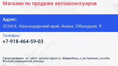 Магазин по продаже автоаксессуаров по адресу 353451, Краснодарский край, Анапа, Объездная, 9 в дальнейшем Организация, размещена в следующих категориях: