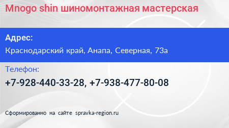 Mnogo-shin, шиномонтажная мастерская по адресу Краснодарский край, Анапа, Северная, 73а в дальнейшем Организация, размещена в следующих категориях: