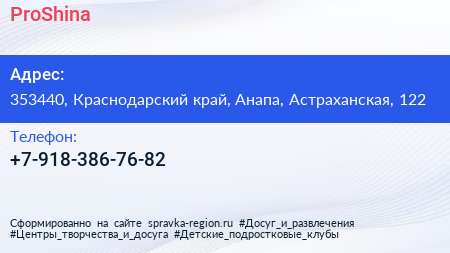 ProShina по адресу 353440, Краснодарский край, Анапа, Астраханская, 122 в дальнейшем Организация, размещена в следующих категориях: