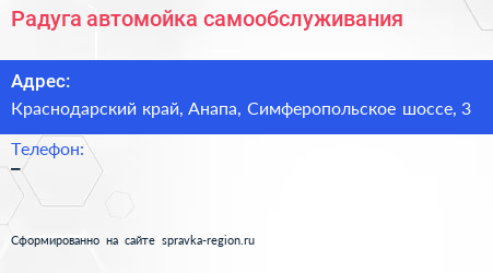Радуга, автомойка самообслуживания по адресу Краснодарский край, Анапа, Симферопольское шоссе, 3 в дальнейшем Организация, размещена в следующих категориях: