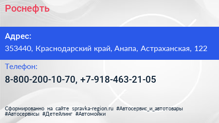 Роснефть по адресу 353440, Краснодарский край, Анапа, Астраханская, 122 в дальнейшем Организация, размещена в следующих категориях: