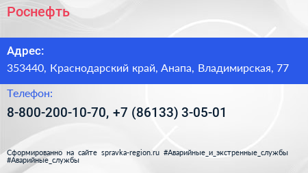 Роснефть по адресу 353440, Краснодарский край, Анапа, Владимирская, 77 в дальнейшем Организация, размещена в следующих категориях: