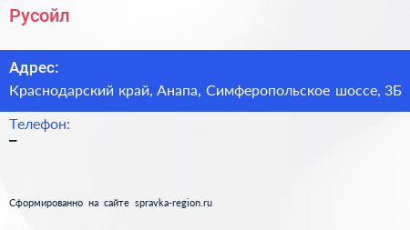 Русойл по адресу Краснодарский край, Анапа, Симферопольское шоссе, 3Б в дальнейшем Организация, размещена в следующих категориях: