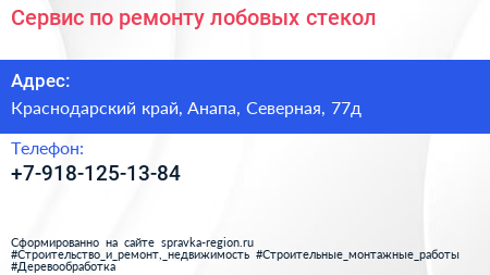 Сервис по ремонту лобовых стекол по адресу Краснодарский край, Анапа, Северная, 77д в дальнейшем Организация, размещена в следующих категориях: