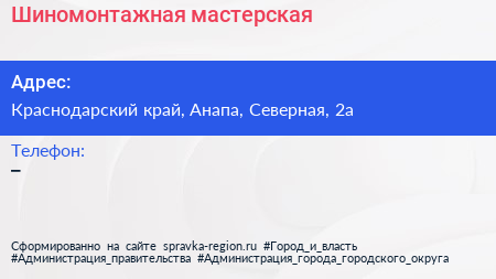 Шиномонтажная мастерская по адресу Краснодарский край, Анапа, Северная, 2а в дальнейшем Организация, размещена в следующих категориях: