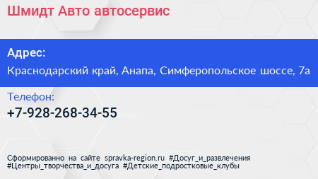 Шмидт-Авто, автосервис по адресу Краснодарский край, Анапа, Симферопольское шоссе, 7а в дальнейшем Организация, размещена в следующих категориях:
